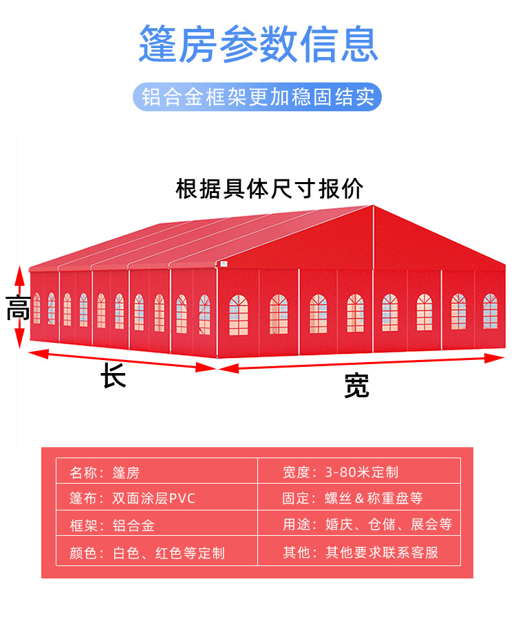 以上价钱仅为常规尺寸不含税不含运费,因为是定制品,都是根据具体尺寸报价(材料为铝合金框架 pvc篷布),可以详询客服,欢迎随时咨询常州迈斯特篷房,若直接拍下则默认发相同价值的配件,不退换。