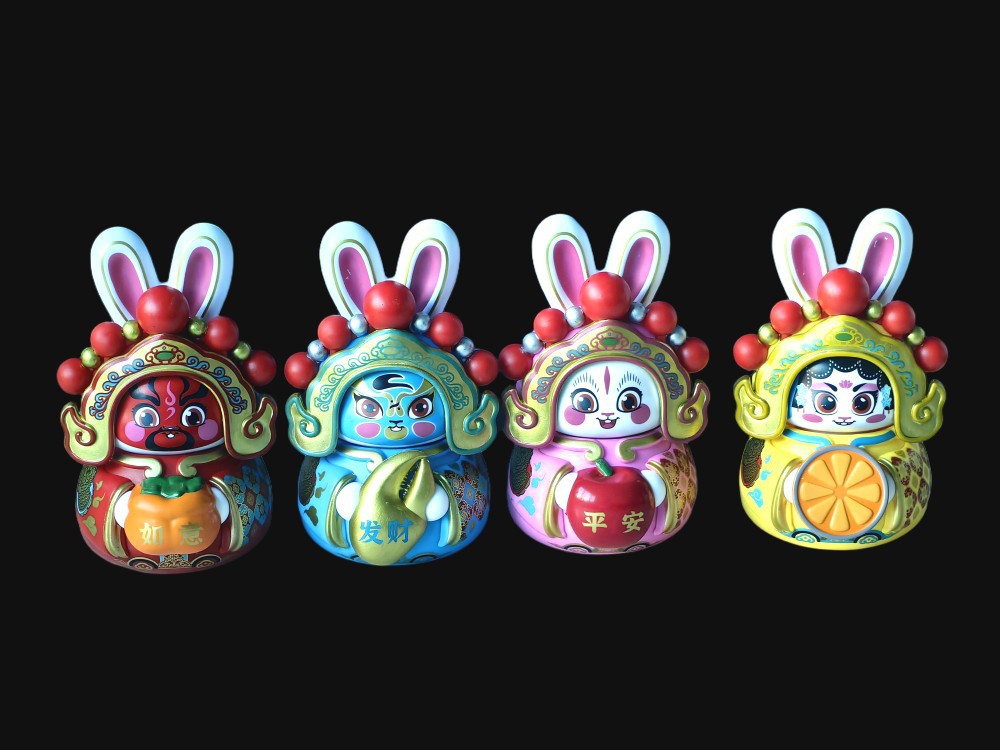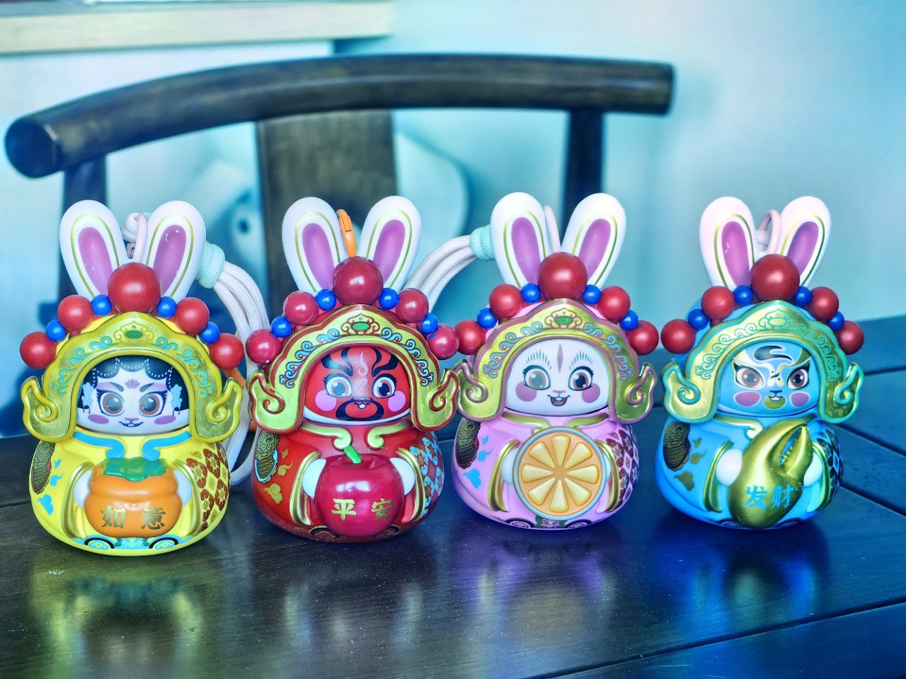 它把老北京兔儿爷的吉祥寓意和脸谱文化结合,按动尾巴换脸谱的设计很巧妙,而每个造型对应的寓意也很讨喜: