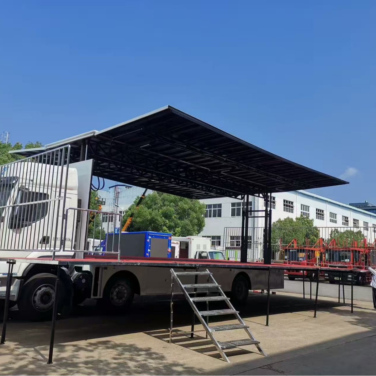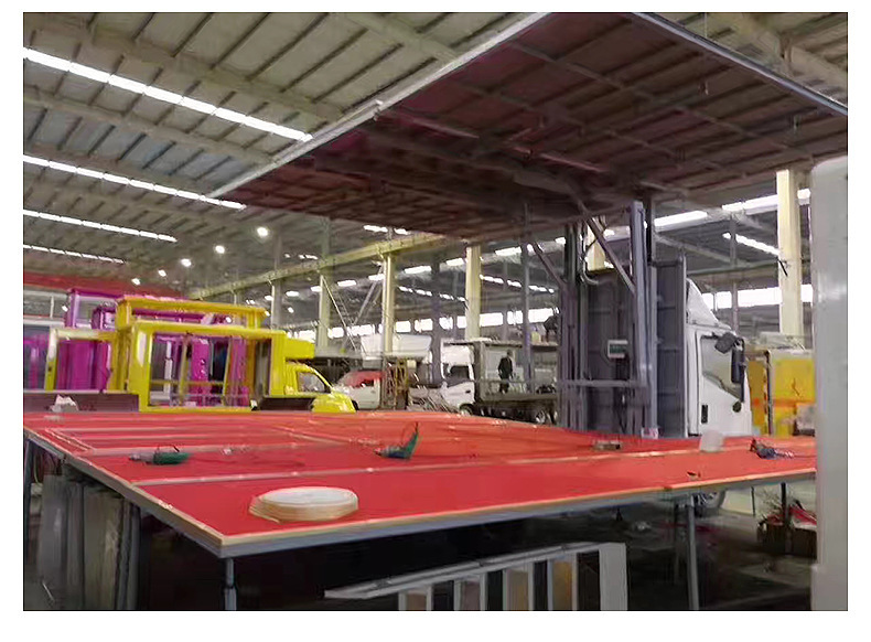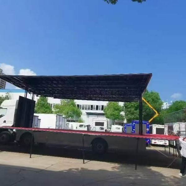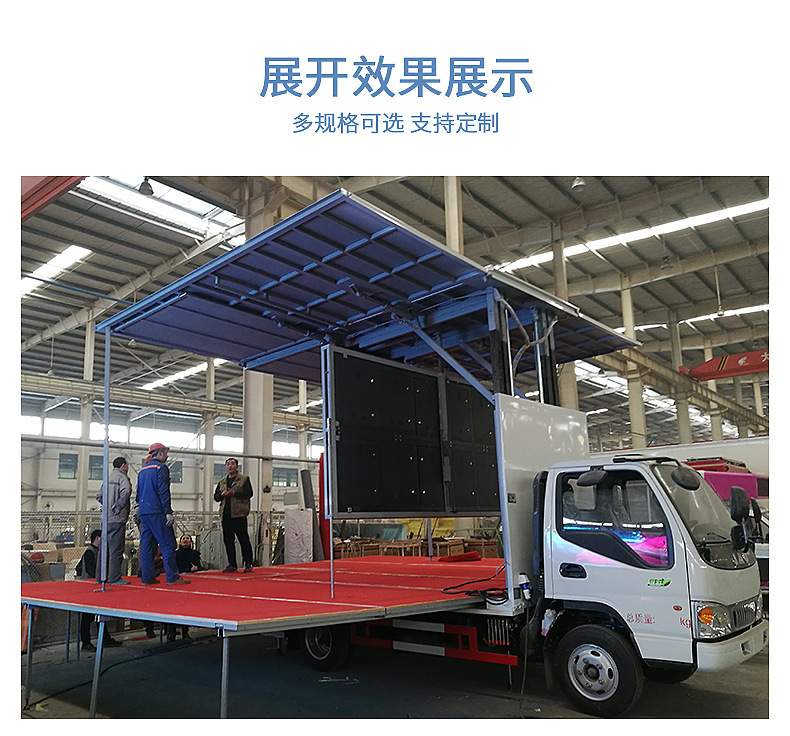 展开方式:左右两侧板与厢体顶部通过四根液压缸连接,当液压缸伸出时侧板向上展开90度,与顶板保持“一”字平衡,形成遮雨或太阳的顶棚。顶棚有四根液压柱高可升高1500MM。左右内藏式舞台板通过液压装置向外展出平衡车底板,后厢板通过液压装置,往下翻转90度与厢底板平行,开成连体大舞台。