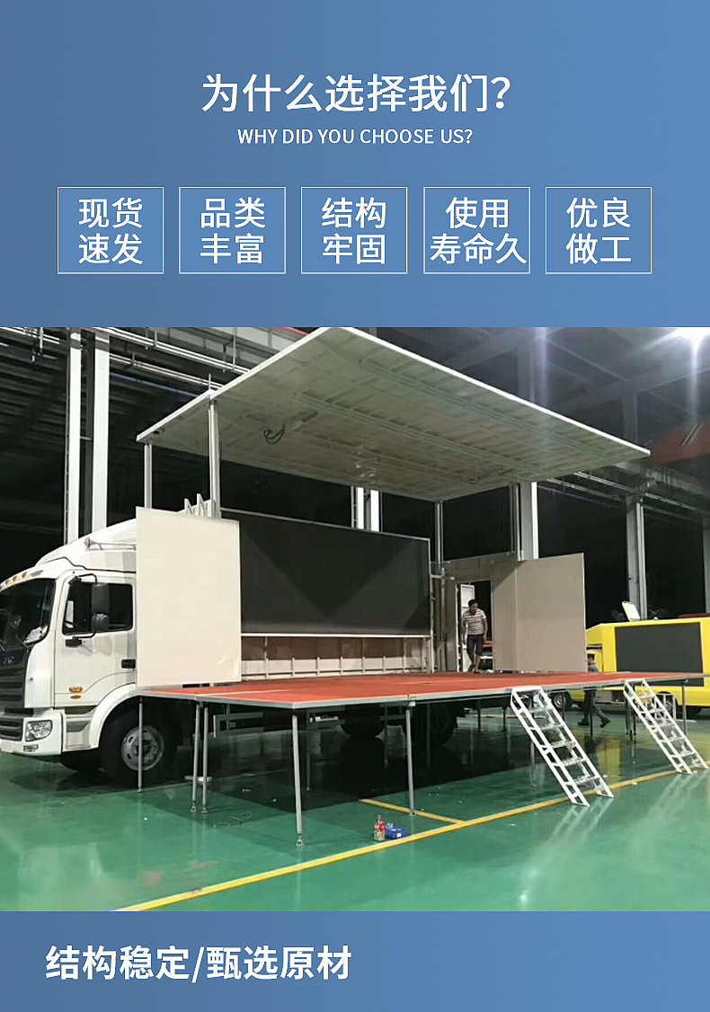 此款舞台车做成一面展、二面展,三面展 适用于产品促销,商业路演,结婚生日庆典等。