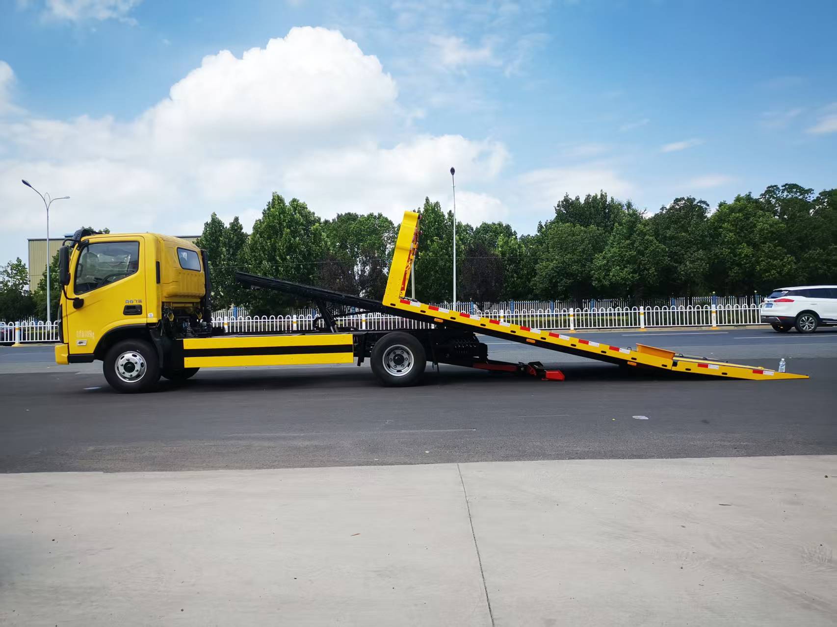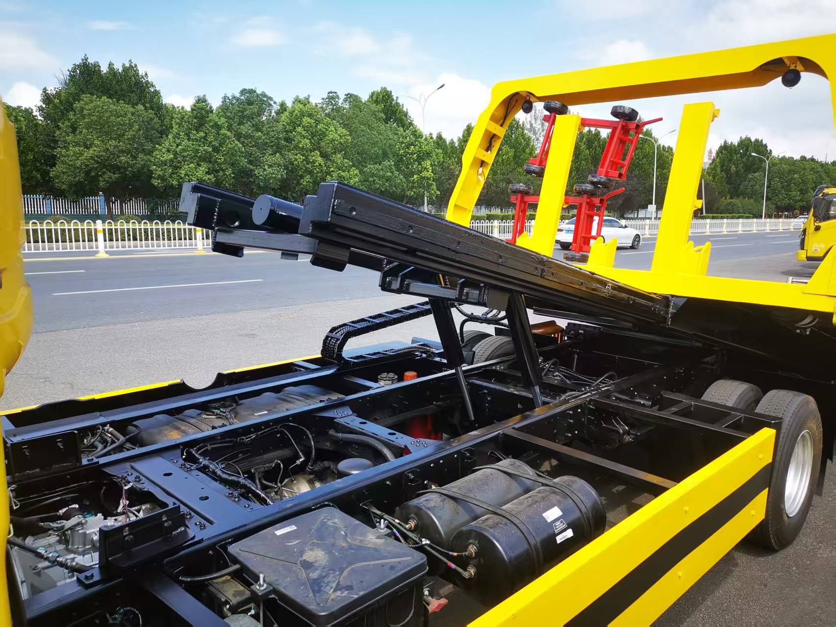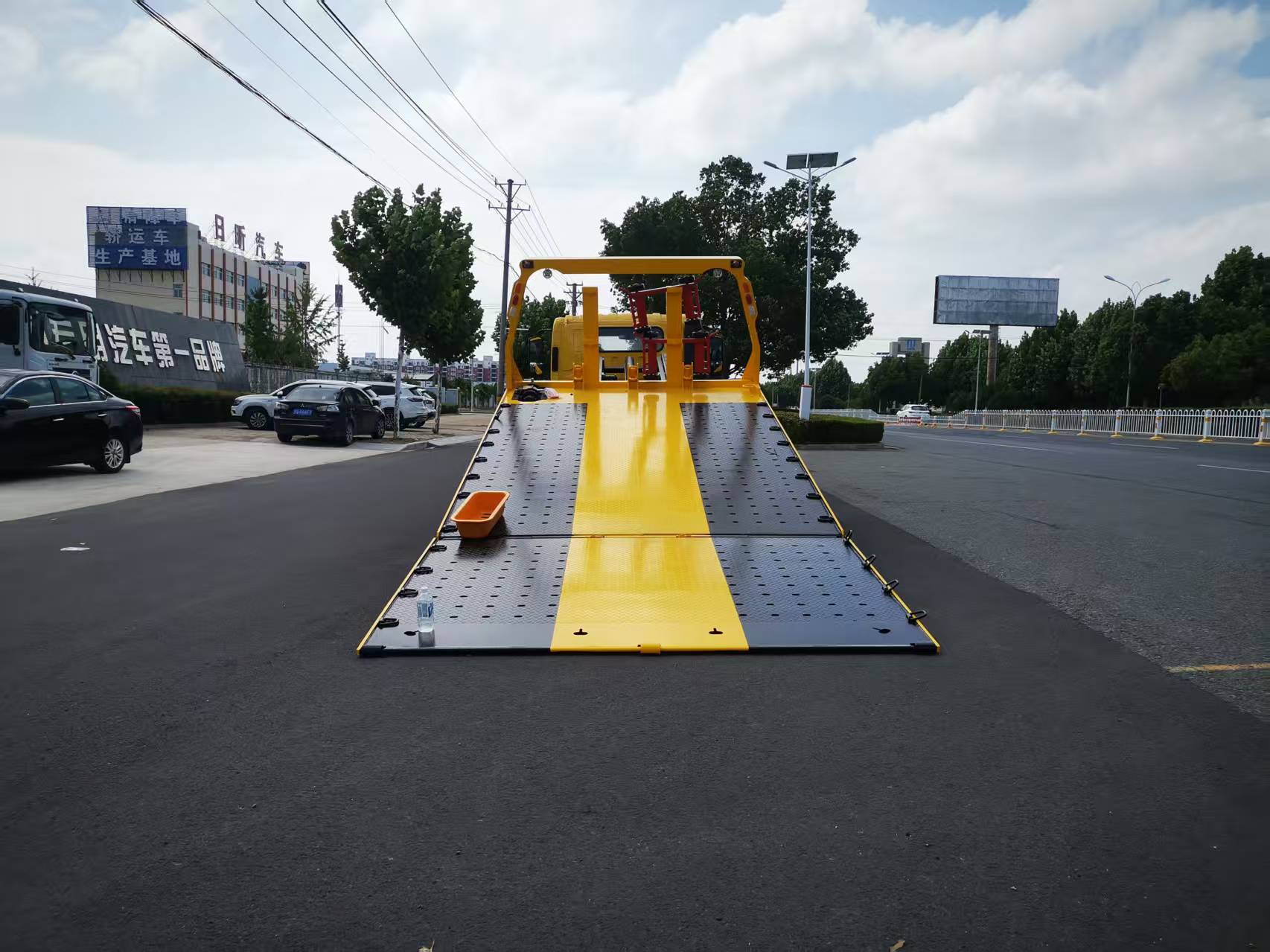 上装配置:重载7吨上装,下沉工艺,一体液压翻转板,通轴合页,5个厚花纹板打孔,板长5.3-5.8米可选,宽2.3-2.5可选,14个厚实心钢板边框打孔,110的主伸缩油缸,100举升油缸,10个 厚滑道,加密田字格,双副梁,一个4吨卷盘,标配后托臂挂在主梁上,支撑点全加固加强,L型抱胎架一对 ,轮胎挡板2个,2个辅助小车,4根绑带,双钩等,板上可承载8吨左右