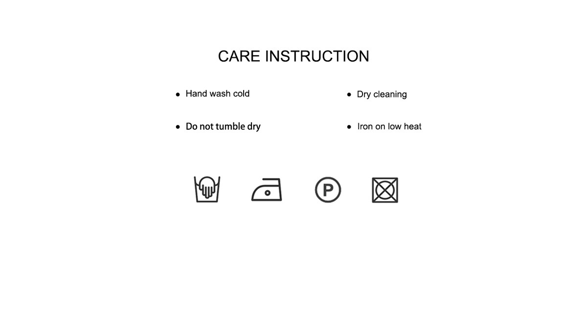 洗涤方式:轻柔冷水洗涤,低温熨烫,切勿漂白或热水浸泡,请勿甩干
