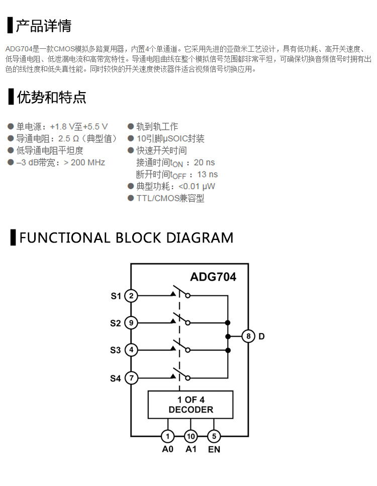 Оригинальный подлинный Adg704Brmz-Reel7 Msop-10 4:1 канал Cmos аналоговый мультиплексор