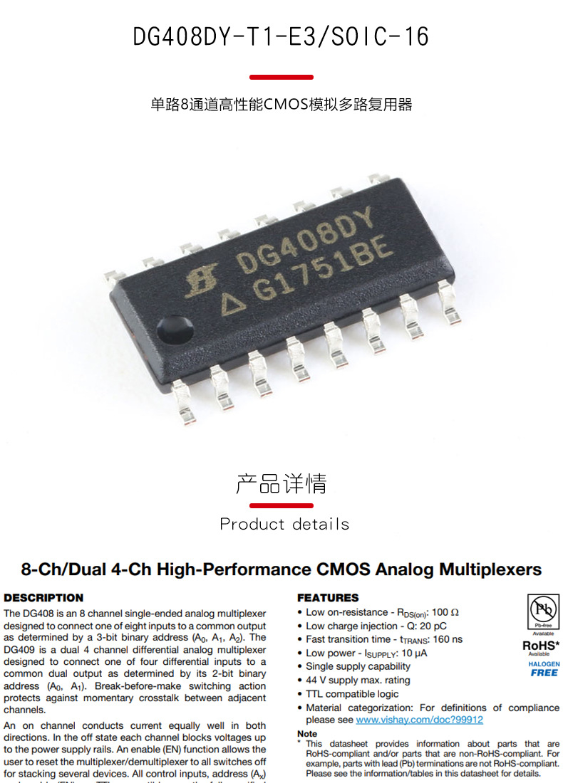 Оригинальный Dg408Dy-T1-E3/Soic-16 одноканальный 8-канальный высокопроизводительный Cmos аналоговый мультиплексор