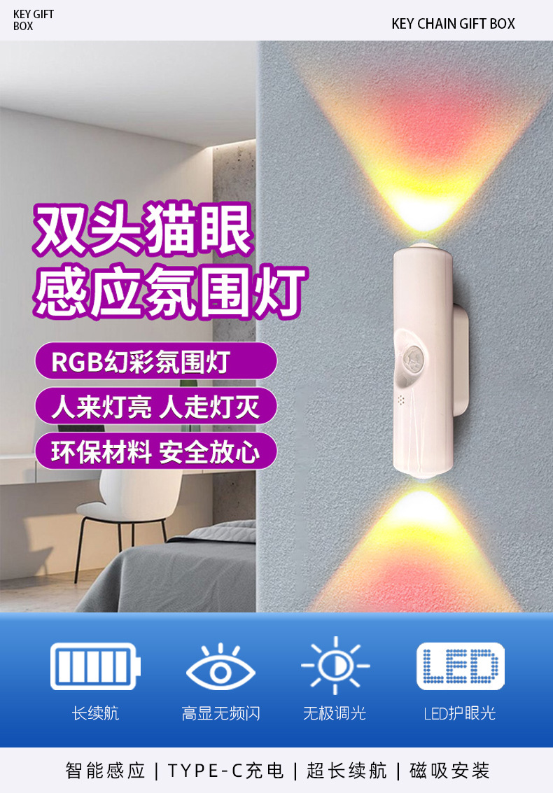 Оптовая продажа умной лампы с датчиком человеческого тела, цветная перезаряжаемая настенная лампа, ночник в виде холма, двойной глаз кота, атмосферный свет