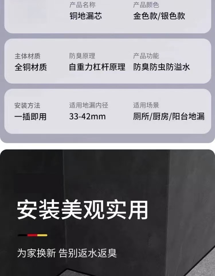 ![]() | Alloy copper-colored edging and widened anti-odor floor drain core | ¥2.5 / ≈ 30 ₽ | 2668 | 5985253092808 | |