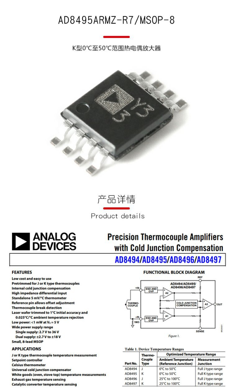 Оригинальный чип Ad8495Armz-R7 Msop-8, термопара типа K, диапазон 0 ℃ -50 ℃