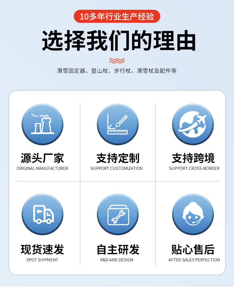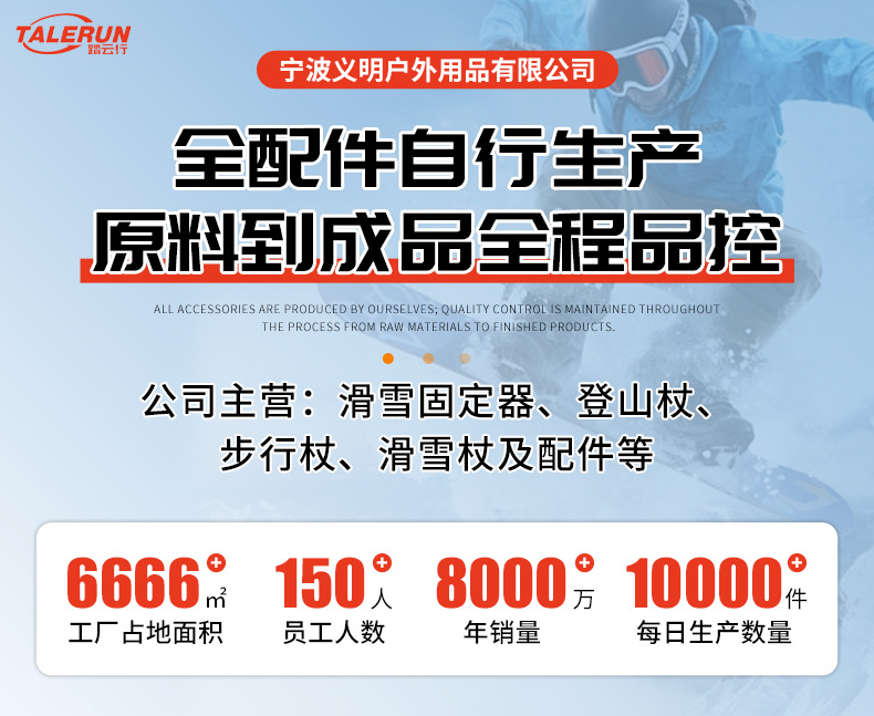 在研发与技术上,6 人专业团队实力突出,登山杖符合ISO7331标准,固定器建立了自有标准并配备冷冻测试设备。公司坚持自行生产所有配件,这一独特工艺让产品质量更可控、交货更及时,而9台注塑机、30多台缝纫机等中高水平的设备,也为高效生产提供了保障。
