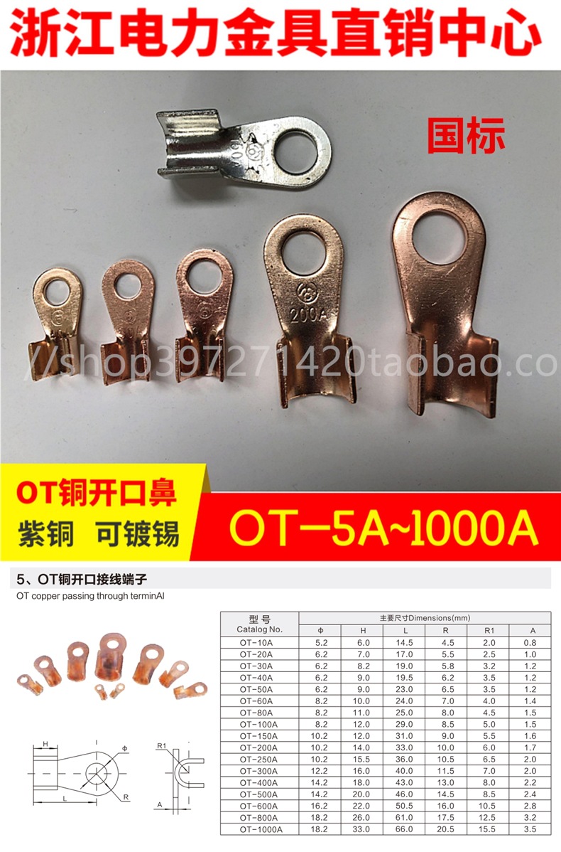 Медный разъем Grade A Open Nose Ot-200A, медный соединитель, проводной ухо, медленный клеммный блок, также Dt Dtl, провинция Чжэцзян