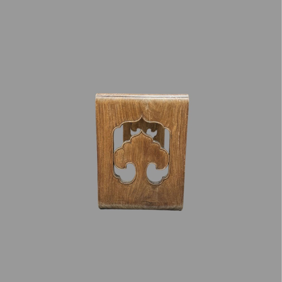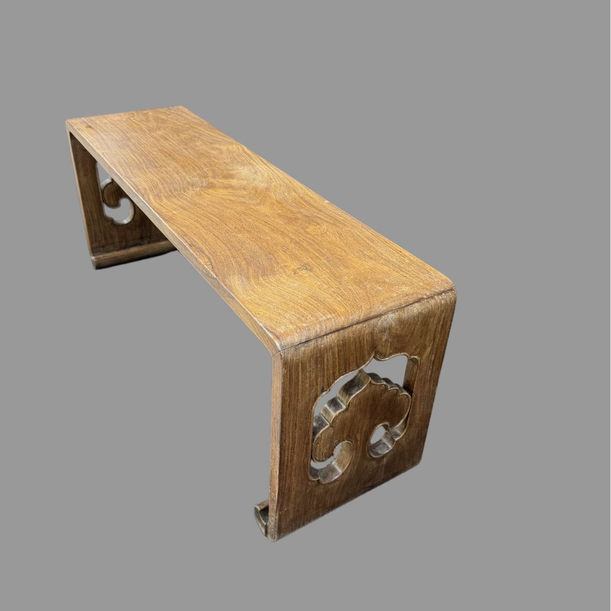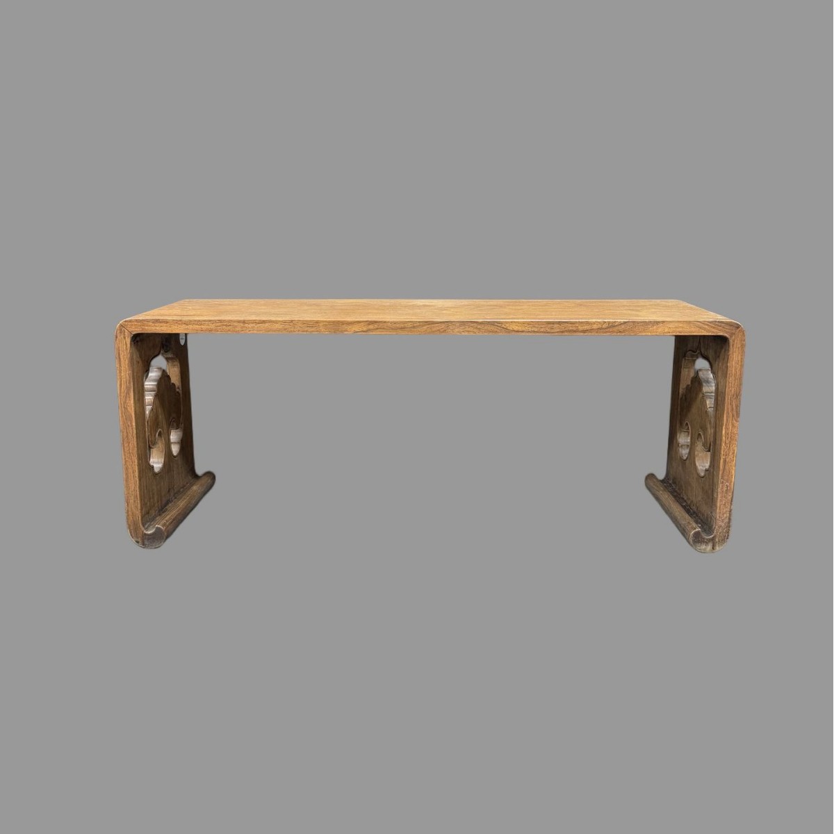 琴几黄花梨木制就。下卷式,几面、腿足均为独板制就。两腿间如意云纹开光。