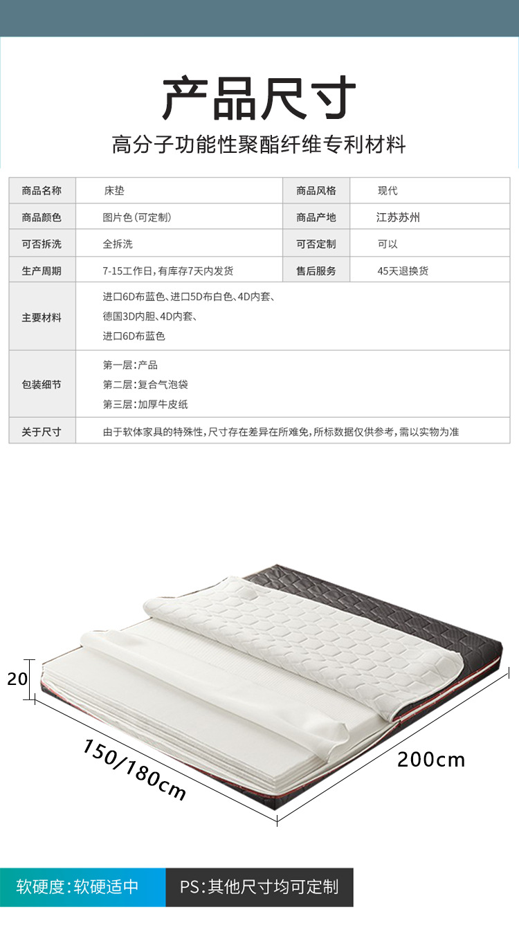 ![]() | 20cm thick 5d white jacket + 3d breathable inner cover + 9-layer 3d glue-free bed core 20cm thick | 1500mm*2000mm | ¥3580.0 / ≈ 43 123 ₽ | 200 | 6150050154136 | |