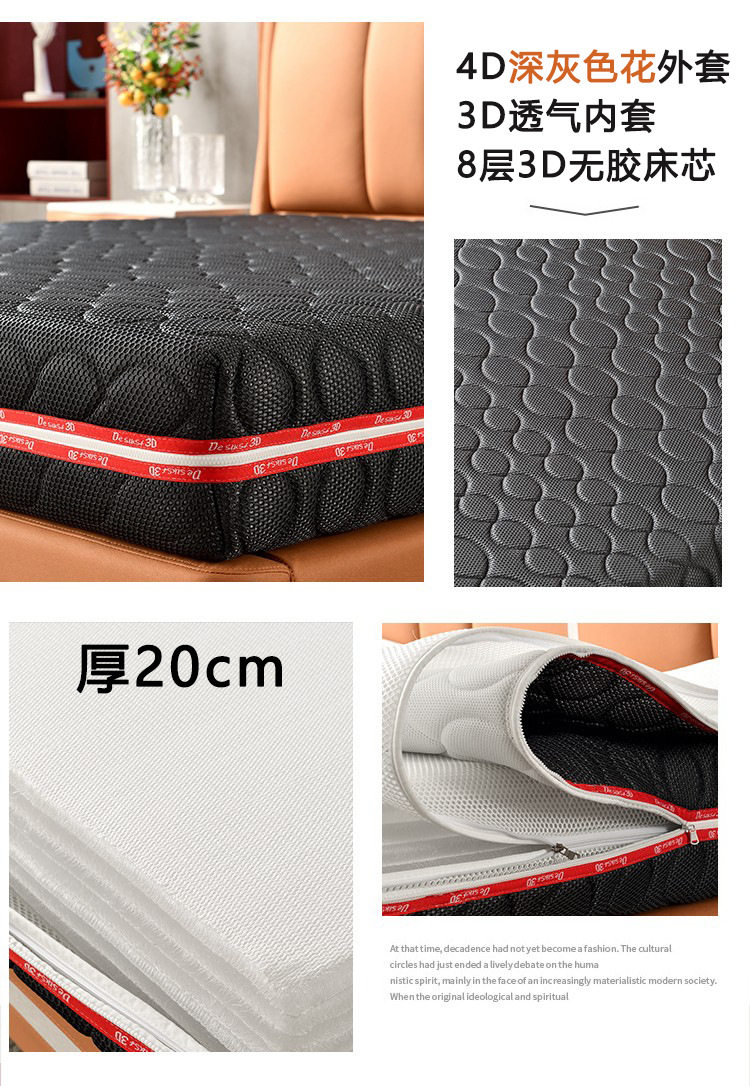 ![]() | 20cm thick 4d dark gray flower jacket + 3d breathable inner cover + 8-layer 3d glue-free bed core 20cm thick | 1500mm*2000mm | ¥3580.0 / ≈ 43 123 ₽ | 200 | 6150050154129 | |