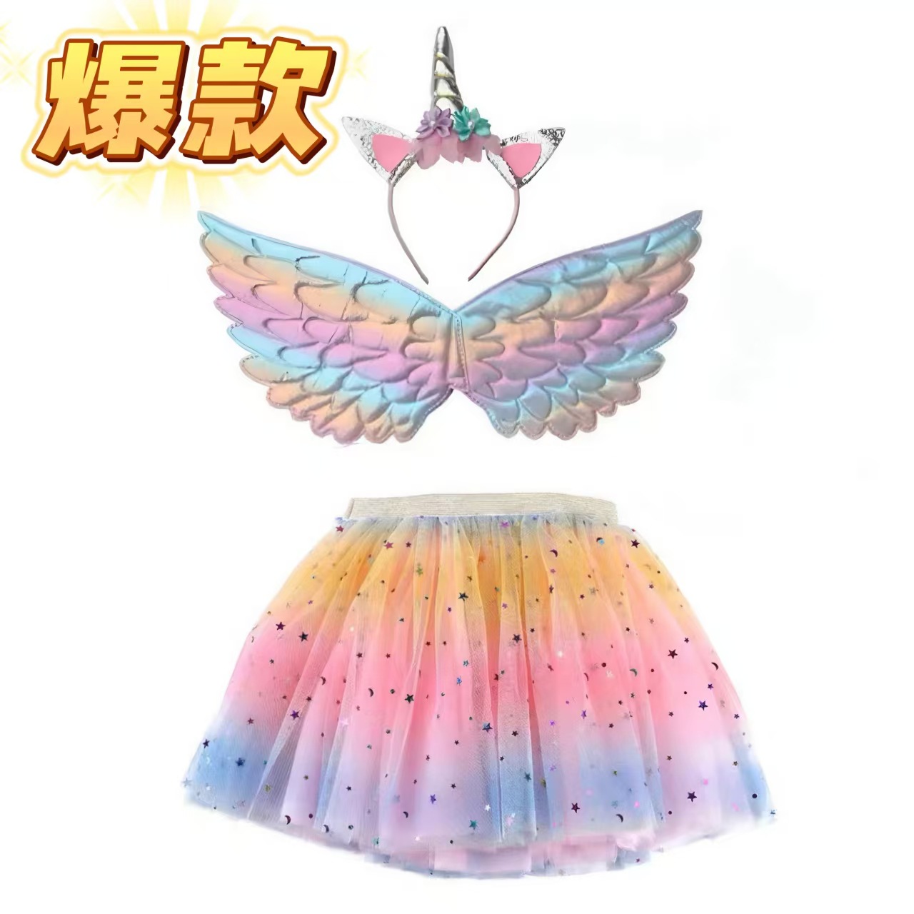 Новый костюм единорога для девочек, радужный трехпредметный комплект с крыльями, юбкой и головным убором для вечеринки, Хэллоуина, дня рождения