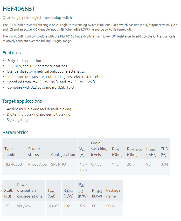 资料链接:http://www.nexperia.com/products/logic/i-o-expansion-logic/analog-switches/HEF4066BT.html