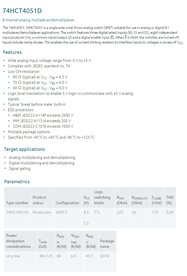 资料链接:http://www.nexperia.com/products/logic/i-o-expansion-logic/analog-switches/74HCT4051D.html
