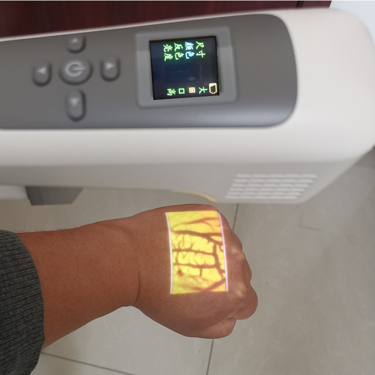 利用特定波长近红外线照射皮肤,血管因血红蛋白的存在将光线吸收,而其他组织则对光线产生强散射和弱吸收,使用近红外摄影装置捕获反射或散射的近红外光,将捕获的信息经过光电转换和图像处理,终定位血管具体位置投影至对应部位,供医护人员实时观测血管。