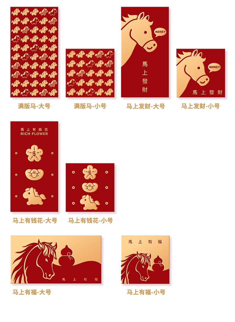 ![]() | L type-large size [full version of horse] | New year's high-end hot stamping red envelope | ¥0.2 / ≈ 2 ₽ | 9992530 | 5989156317331 | |