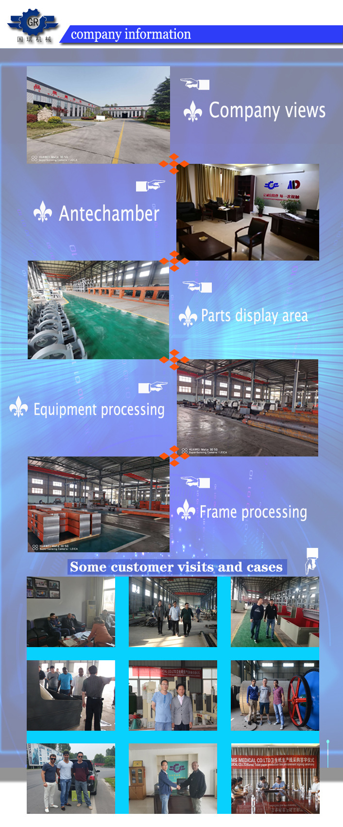国瑞造纸机械设备有限公司专业生产造纸机械和制浆设备,主要产品包括:各种型号高速卫生纸、餐巾纸造纸机、文化纸造纸机、工业包装纸造纸机、中高速迷信纸造纸机以及特种纸造纸机等。在过去的40多年的生产、销售过程中,我们拥有了一批精良的技术团队,形成了完善的售前服务、售后技术支持和产品质量严格把控的经营管理体系。产品畅销全国18个省,远销越南、蒙古、巴西、乌兹别克斯坦、西非、南非等10多个国家与地区。如果您有任何问题,请随时联系我们,期待与您的合作!