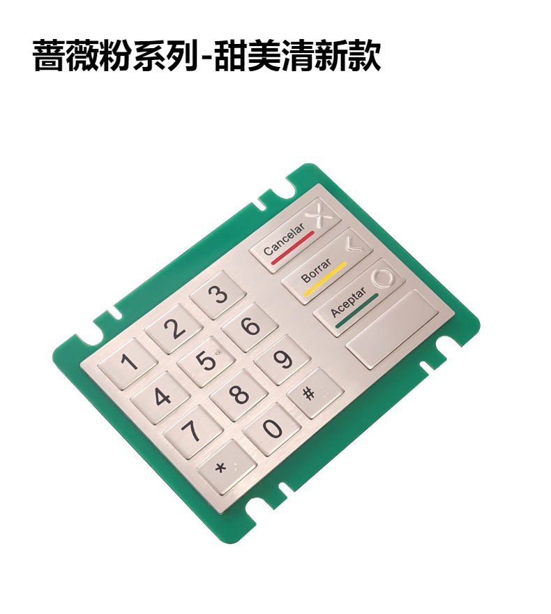 特点:采用腐蚀按钮,外观美丽,模具精密,安装方式为里往外装;表面耐磨损,可抵御故意破坏,按键不易脱落损坏,支持定制多语言键面。