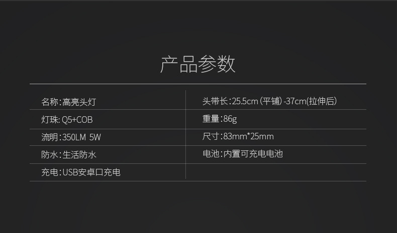 【充电方式】:micro USB充电 充电时间2小时 照明时间4-5小时左右