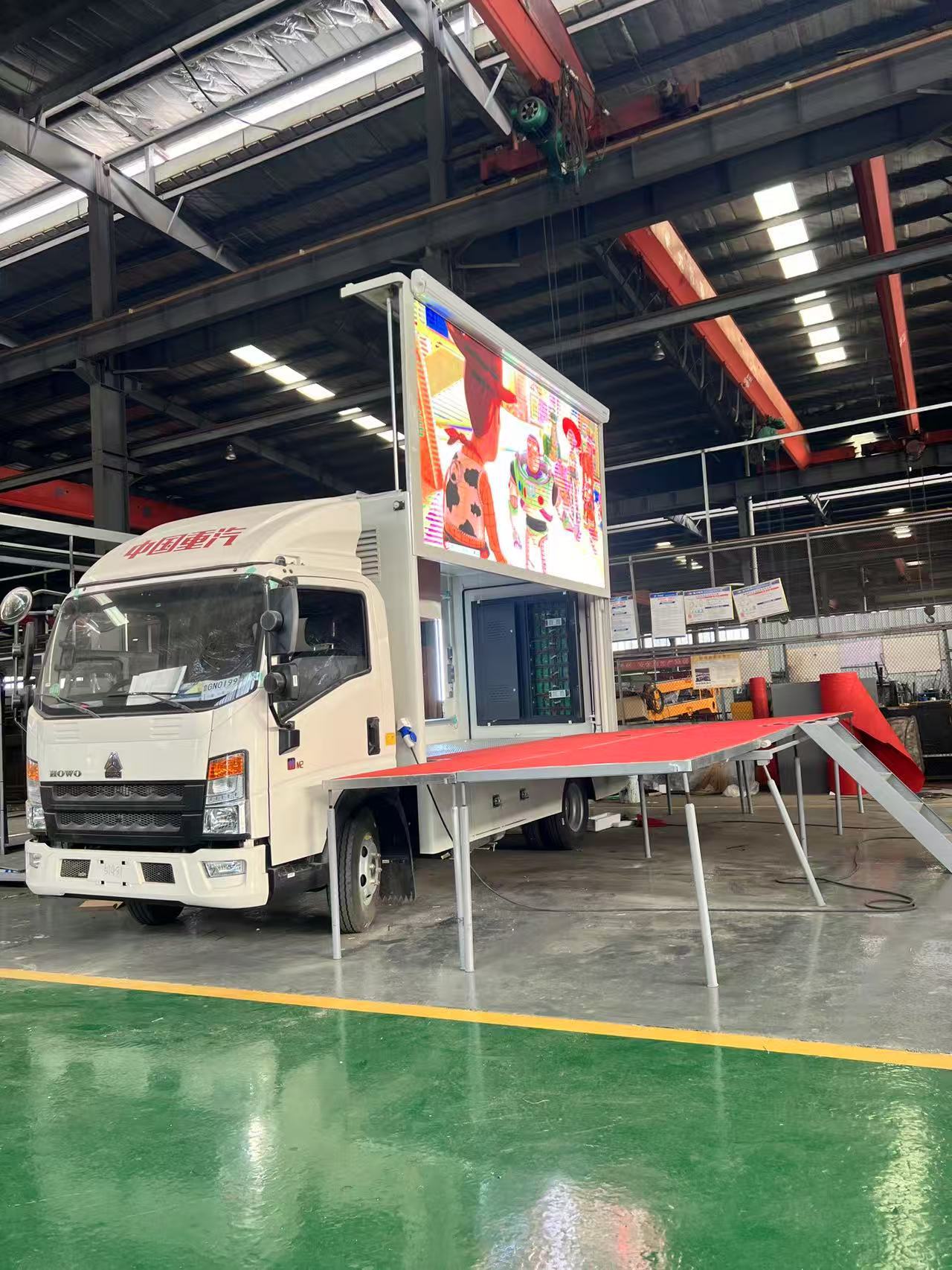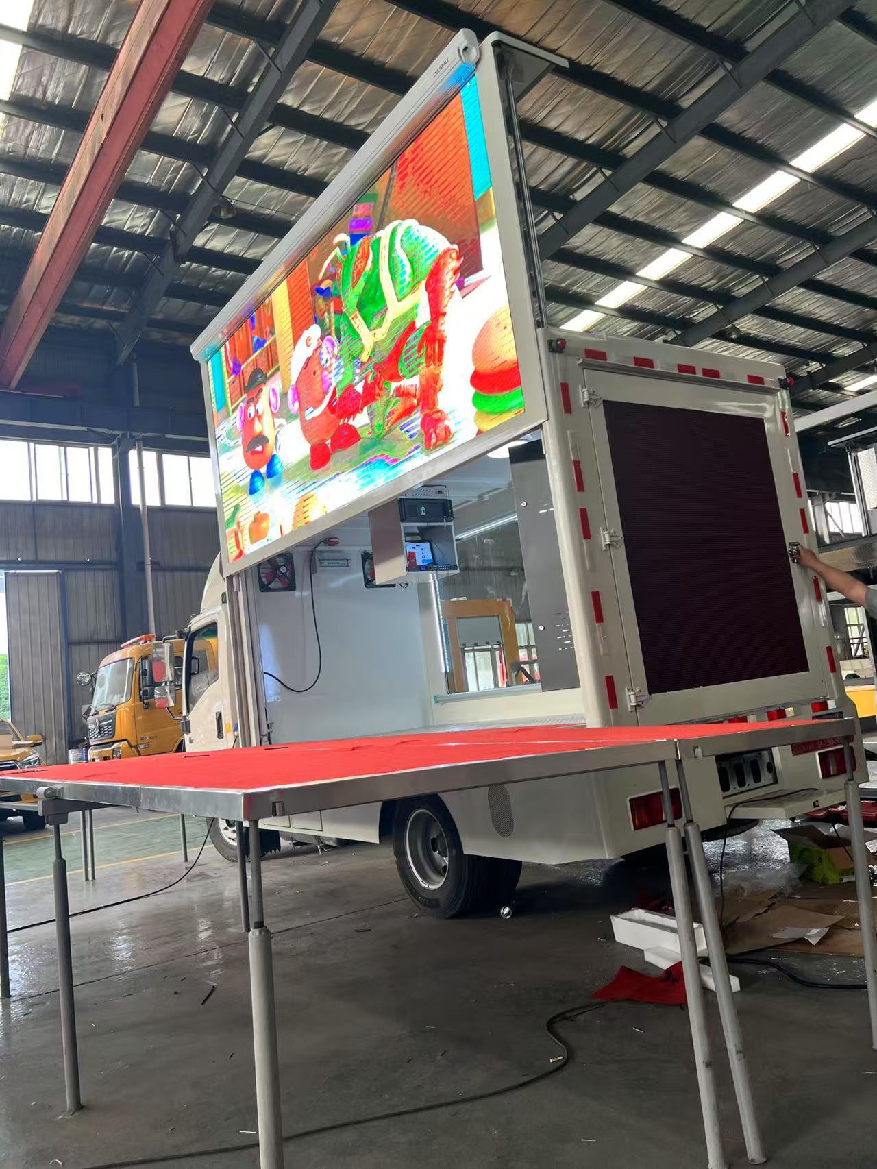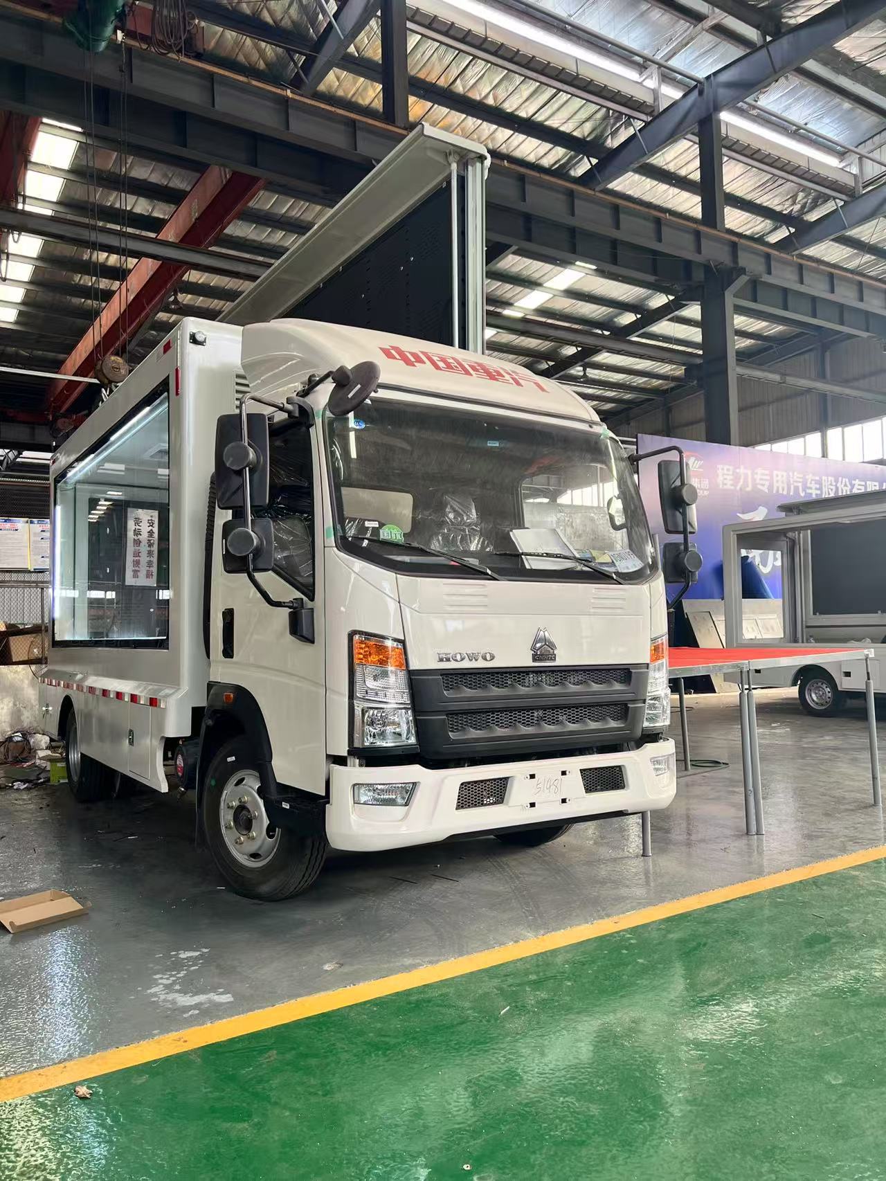 国六 福田康瑞H2宣传车整车型号:CLW5040XXCB6整车尺寸:5995*2180*3200【底盘配置】 轴距:3360mm发动机:全柴115马力排量:2300ml轮胎:700R16钢丝胎其他:ABS,气刹,五档箱,电动门窗,方向助力。【上装配置】1、【LED显示屏】正驾驶侧:户外彩屏,p6,p5 p4可选。P6彩屏尺寸:3840*1728mm=6.63m2P5彩屏尺寸:3840*1760mm=6.75m2P4彩屏尺寸:3840*1760mm=6.75m2尾门单红屏尺寸:1280*1440mm(标配尾门为p10单红字幕屏)2、【滚轴广告灯箱】副驾驶侧:玻璃滚轴广告灯箱,功能:可循环自动播放3-5副广告灯片布(选装双面屏时,无该玻璃滚轴设备)3、【供电系统】柴油发电机1台,品牌:江苏欧玛。类型:静音发电机,水冷,电启动。功率:8kw(单面彩屏配备);15kw(双面彩屏配备)。市电:内外电切换装置,220V市电接口。4、【操作系统】电脑:航嘉工控电脑1台,AOC显示器。控制软件:仰邦或卡莱特。功放:伊威特广播级功放,功率:200W。音柱:4支,功率:30W。5、【通风系统】顶部通风天窗2支,前板百叶窗通风设计,排气扇2支。6、【厢体工艺】碳钢骨架,外蒙1.2冷轧钢板,基层防锈漆,挂腻子,外喷车漆。厢体内部玻璃钢内饰,厢内LED照明,地板铝花纹板。7、【上装配件】彩屏1块,电源盒1个,排线10根,外接电线30米;8、【选装部分】★选装配置1:屏幕液压举升(举升高度1500mm);★选装配置2:液压舞台(约9.6m2)(加装舞台时,需先加屏幕举升功能)。
