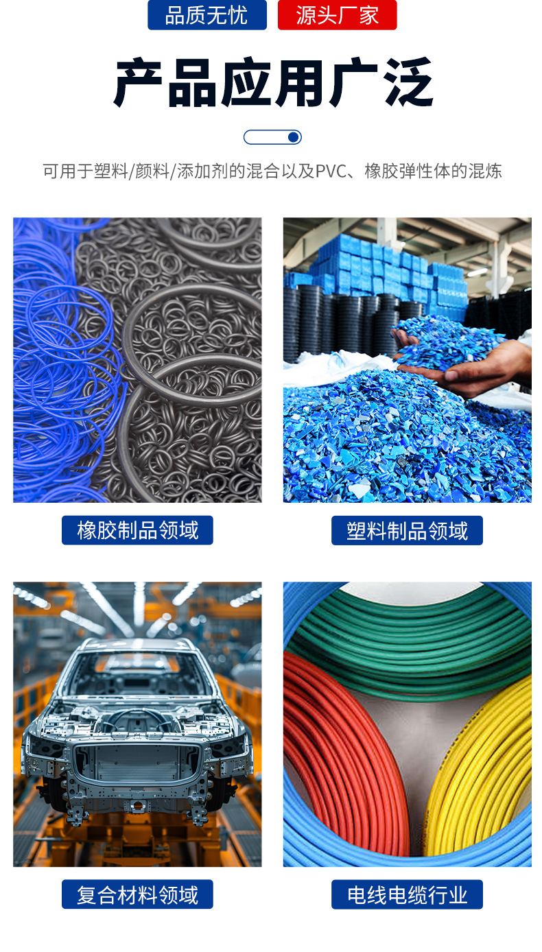 Область применения Mixing of plastics/pigments/additives and mixing of pvc and rubber elastomers, with a solid and reliable structure, a simple and clear human-machine interface, precise temperature control, and security