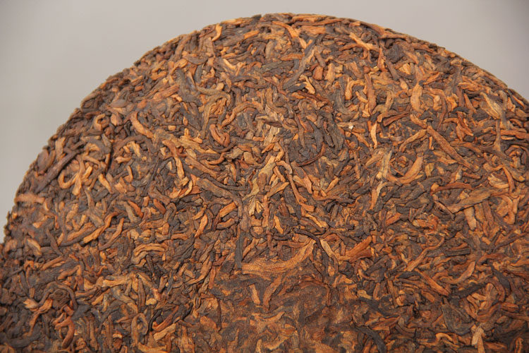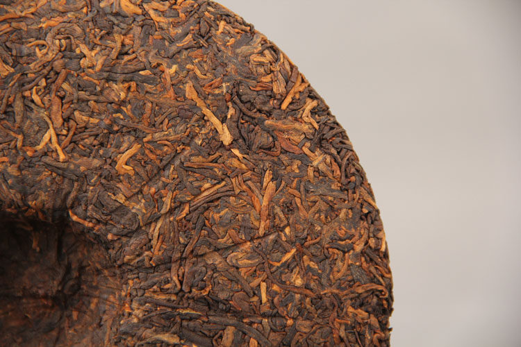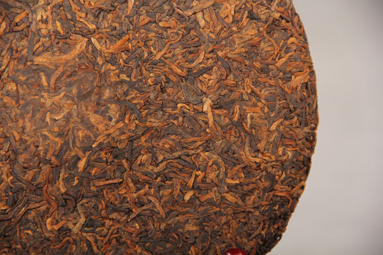 1、用料,拼配大雪山古茶发酵,用筛分后的春茶金芽原料压制,里外一致;