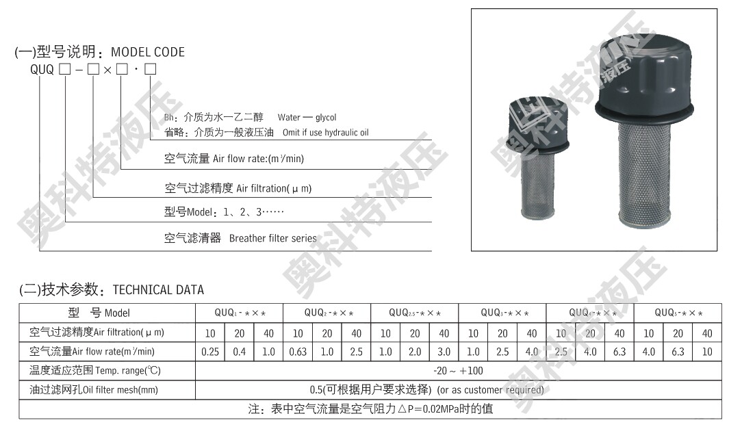 安装于油箱上方,防止空气中之杂物混入油箱,能过滤油箱内油面以上之空气及油箱内之工作油。滤网为可拆式设计,可随时清洗更换维修。空气滤清器以螺丝固定于油箱上。