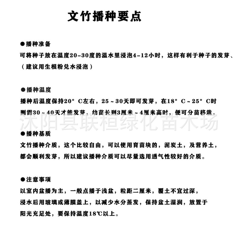 1.播种繁殖文竹的浆果于冬季陆续成熟。当浆果变成紫黑色时,即可采收。浆果采收后,搓去外果皮取出种子。漂洗干净后即可播种。如室温低于15℃,则应等到春暖后再行播种,其间应沙藏、播种,以室内盆播为主,一般点播于浅盆,粒距二厘米,覆土不宜过深,浸水后用玻璃或薄膜盖上,以减少水分蒸发,保持盆土湿润,放置于阳光充足处。播种后温度保持20℃左右,25~30天即可发芽,在15~18℃时则需30~40天才能发芽,幼苗长到3~4cm高时,便可分苗移栽。
