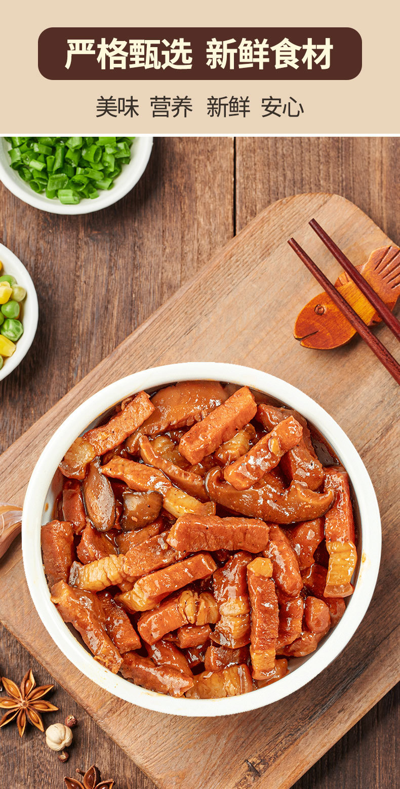 Сырьё и ингредиенты Pork, water, brewed soy sauce, mushrooms, onions, soybean oil, white sugar, ginger, garlic, edible salt, monosodium glutamate, food additives, etc.