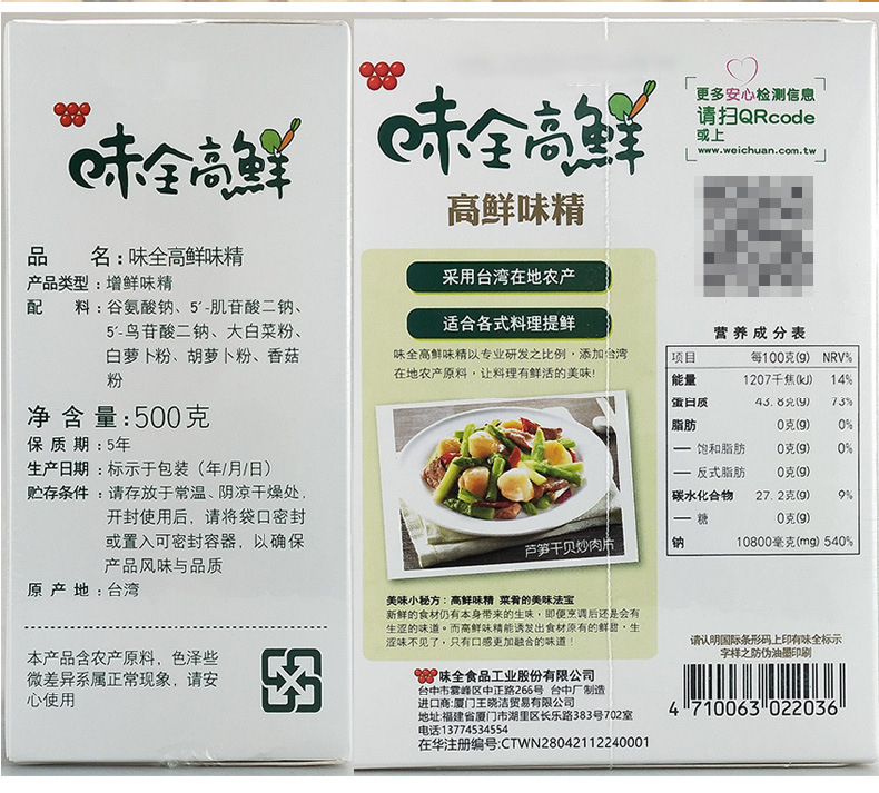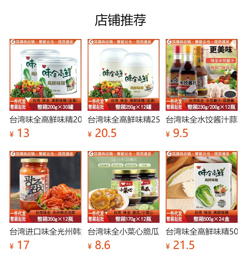 ![]() | (taiwan) weiquan high umami msg 500g | 2шт: ¥25.00, 4шт: ¥24.80, 24шт: ¥24.50 | 303 | 5935495191480 | |