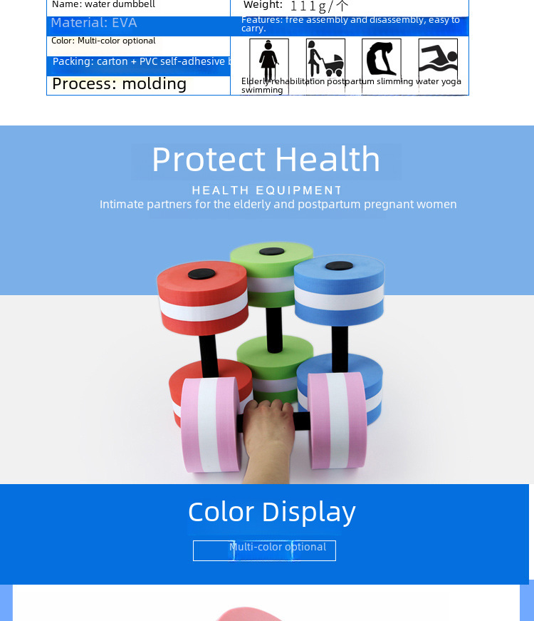 Атрибуты продукта Dumbbells for men and women, fitness equipment, eva water floating dumbbells, eva water dumbbells, water dumbbells, eva dumbbells, children's dumbbells