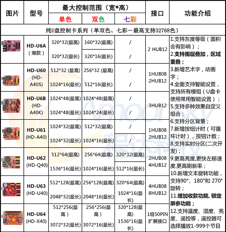 支持温度、湿度、亮度、遥控等(U6A不支持),遥控器可选择播放1-9999个节目;