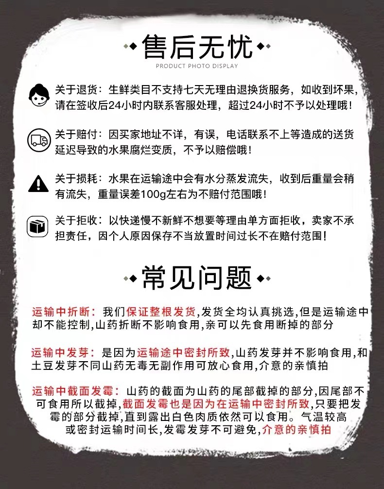 2.我们的山药不浸泡药水,不水洗,都是带着微微的泥土发出的。因山药顶部笼头位置不能食用,所以发出时是去掉笼头后按照下单的长度整根发出的 .
