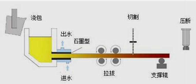 结晶器石墨内孔形状、尺寸,决定了铸铁型材的截面形状,结晶器石墨内孔的光洁度和耐高温性能决定了型材表面的外在质量和尺寸精度,而型材的长度尺寸则根据用户的要求切取。