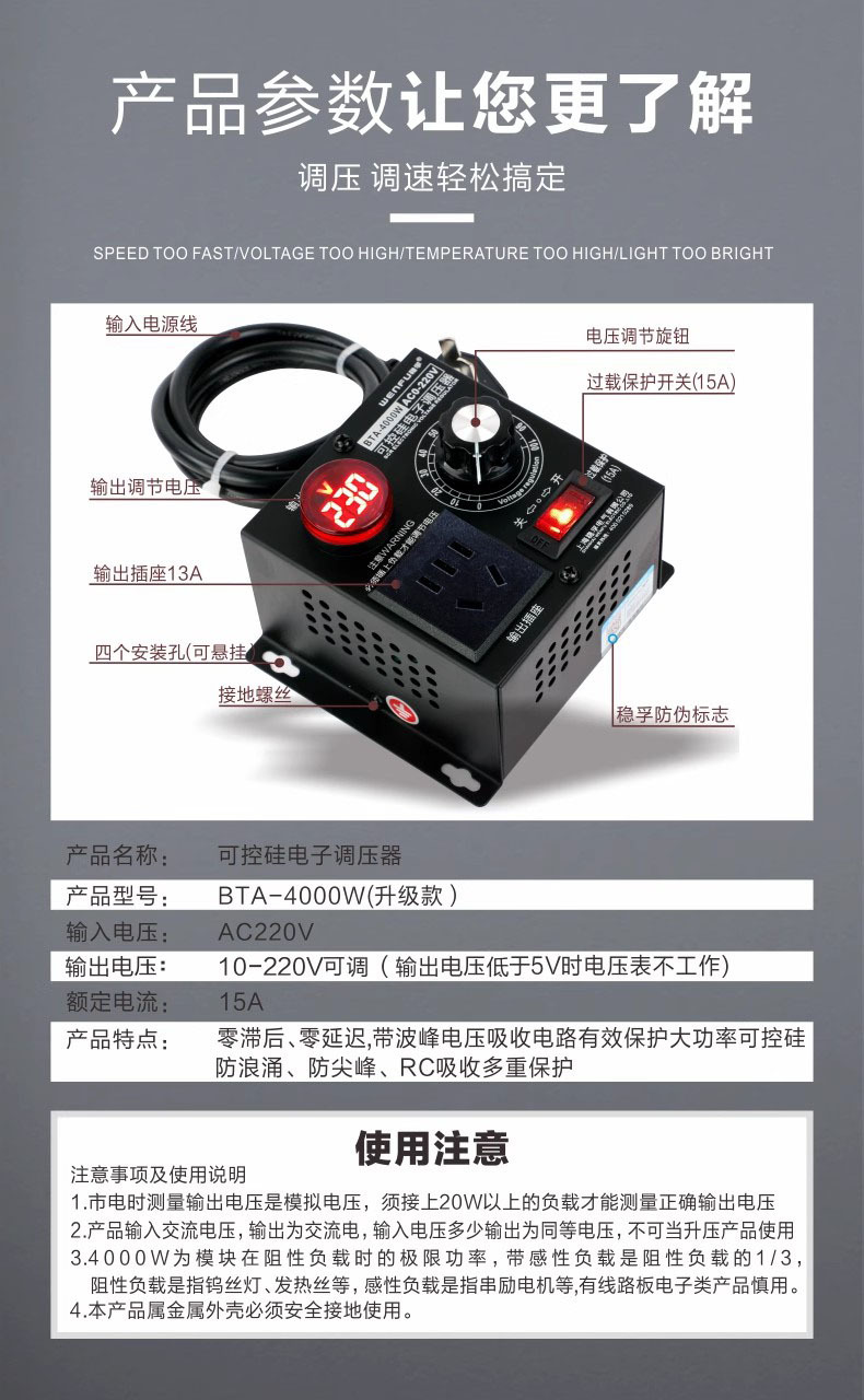 Электронный регулятор напряжения 4000W, тиристорный, для моторов, дрелей, переменная скорость, термостат 220V