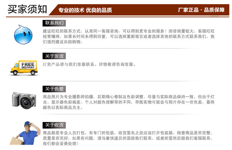4.仓库的货每天都在更新,拍下商品前请旺旺与我们联系确认是否有货,如拍下商品无货,我们将通知您退款或换货,如旺旺不在线,我们会电话或短信通知,如打扰到您的工作,敬请谅解。