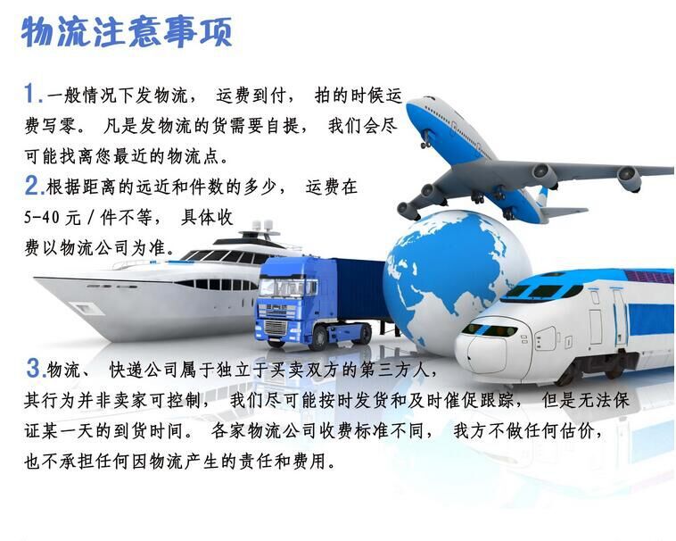 3.物流、快递公司属于独立于买卖双方的第三方人,其行为并非卖家可控制,我们尽可能按时发货和及时催促跟踪,但是无法保证某一天的到货时间。各家物流公司收费标准不同,我方不做任何估价,也不承担任何因物流产生的责任和费用。