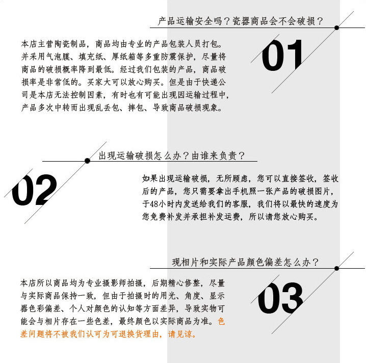 3.付款后第二天或第三天发货,陶瓷不比服装,再加上批发量多,包装比较麻烦,着急的请慎拍哦。