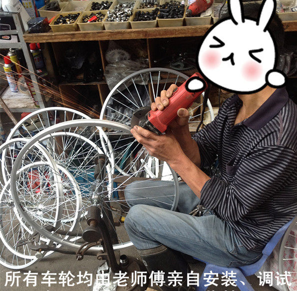 图中老师傅辐条安装好后,正在对突出部位进行打磨,以确保内胎寿命
