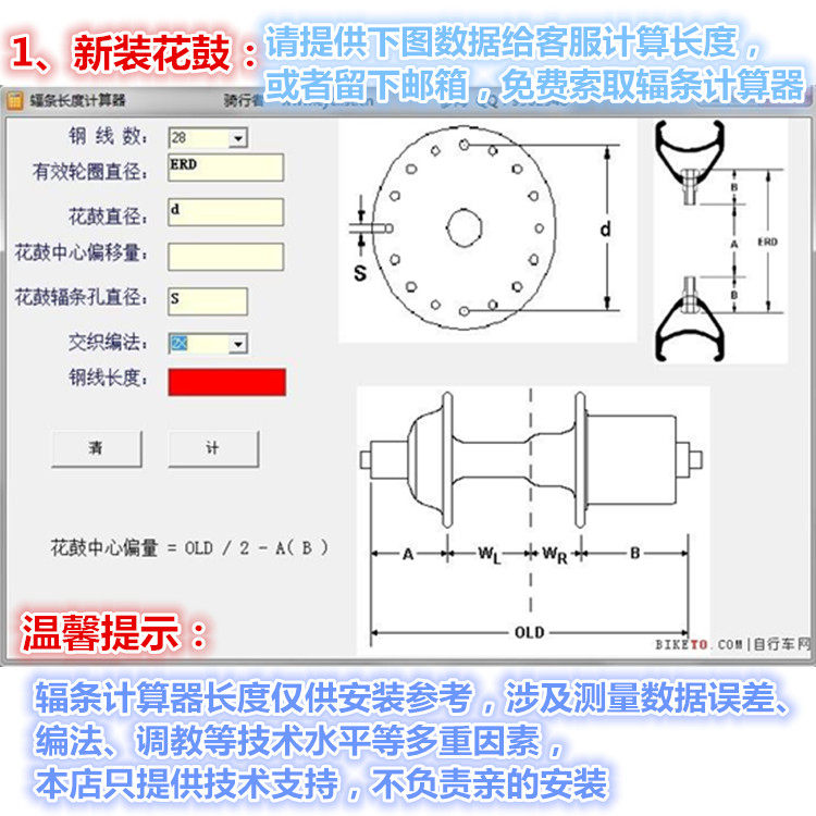 1、亲如果是新换的花鼓,需要自行组装轮组的话,可按照下图提供具体数据或者向客服免费索取“辐条计算器”,需提供邮箱:
