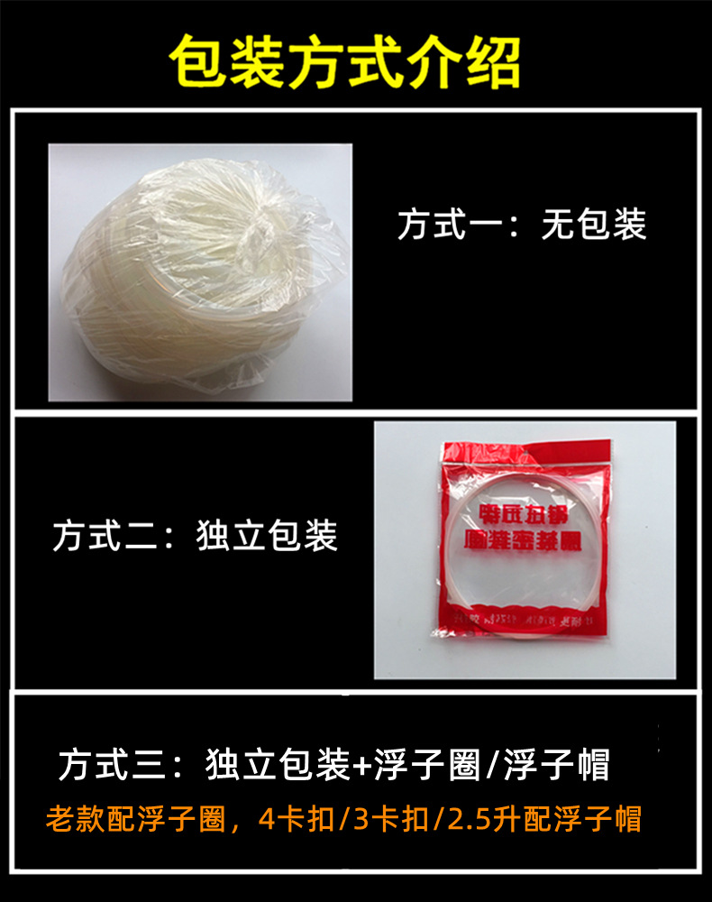 包装方式三:独立包装+浮子圈/浮子帽:老款配浮子圈,4卡扣/3卡扣/2.5升配浮子帽;