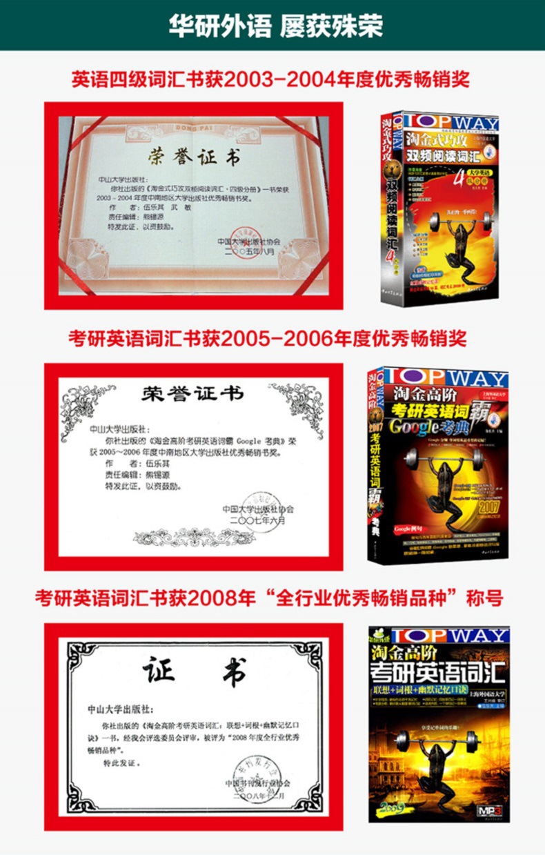 TOPWAY是华研的做事原则,经验表明,方法得当就会事半功倍,让您花更少的时间取得更好的学习效果;“沙里淘金”是华研的思维方式,通过语料库分析、词汇分频、难度分级等诸多科学手段,让您抓住问题的关键,用20%的精力取得80%的成效,体现“二八定律”��从而达到“四两拨千斤”的效果。