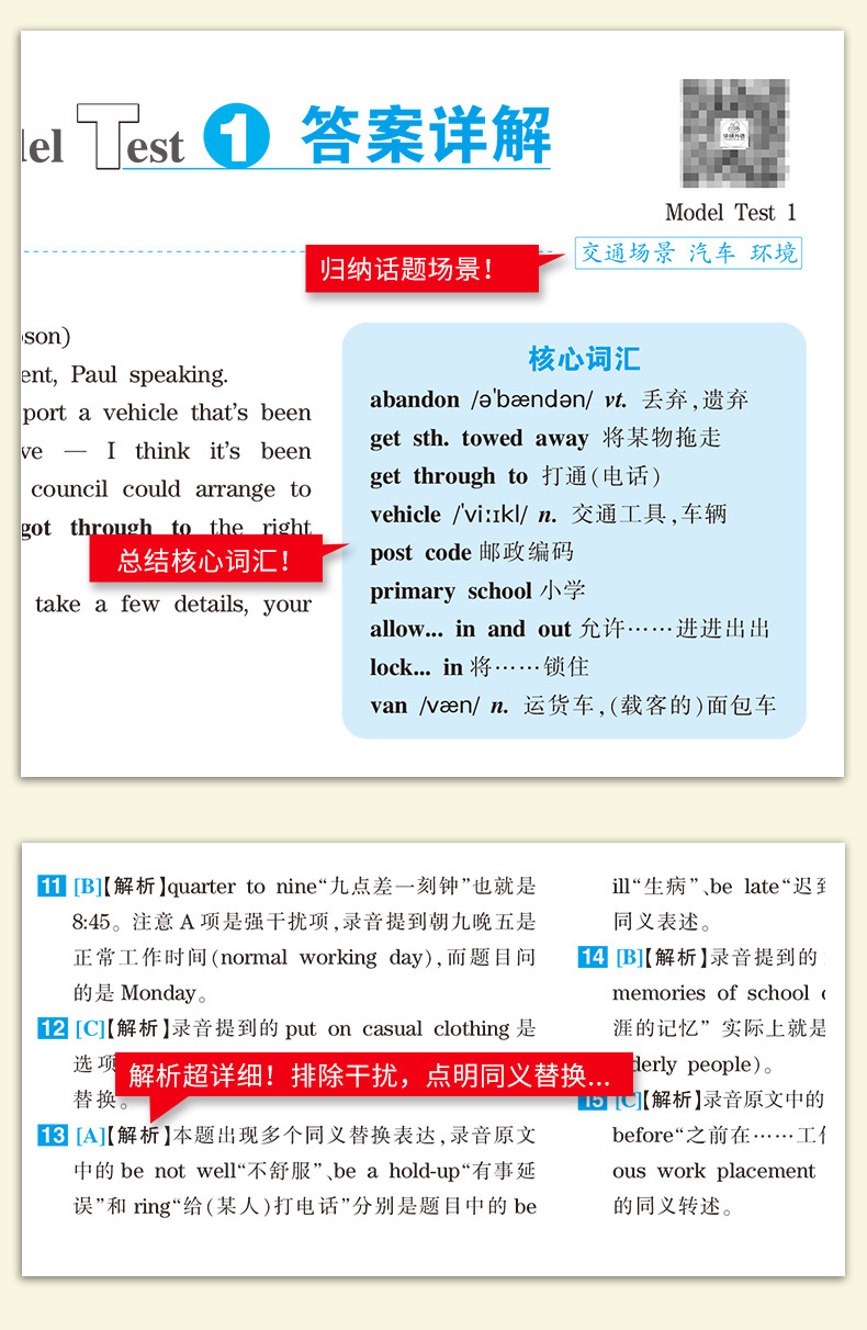 5. 解析详细,归纳核心词汇,录音原文全文翻译,中英文左右对照,解题句画线详解。