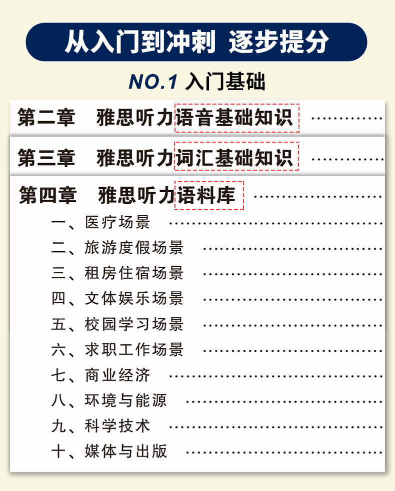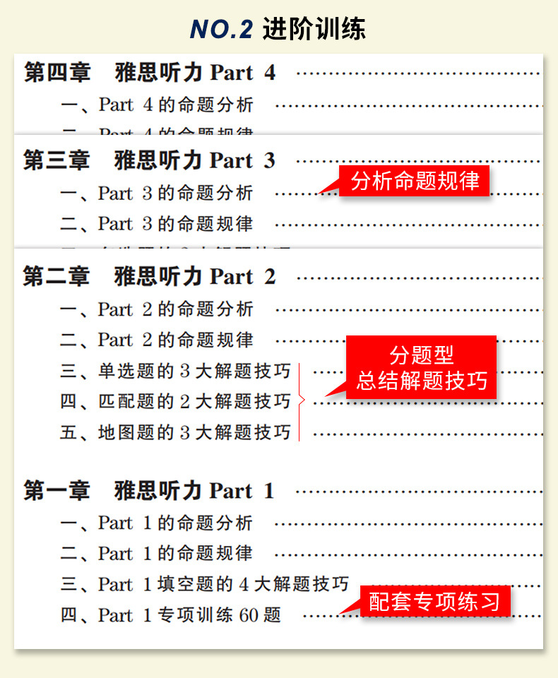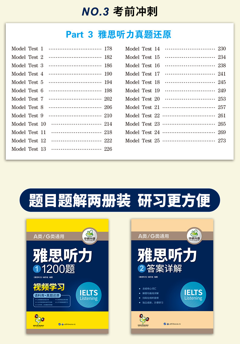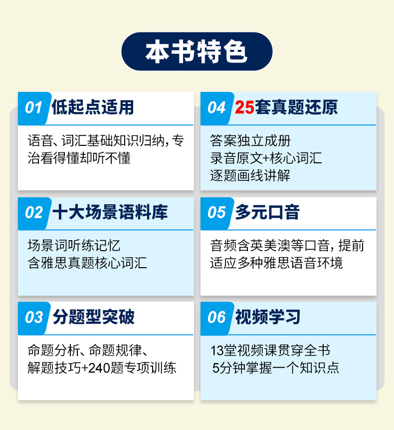 3. 海量训练,包括200题听力基础技能训练、6套专项训练和25套真题还原训练,在海量训练中总结做题技巧和提高分数。