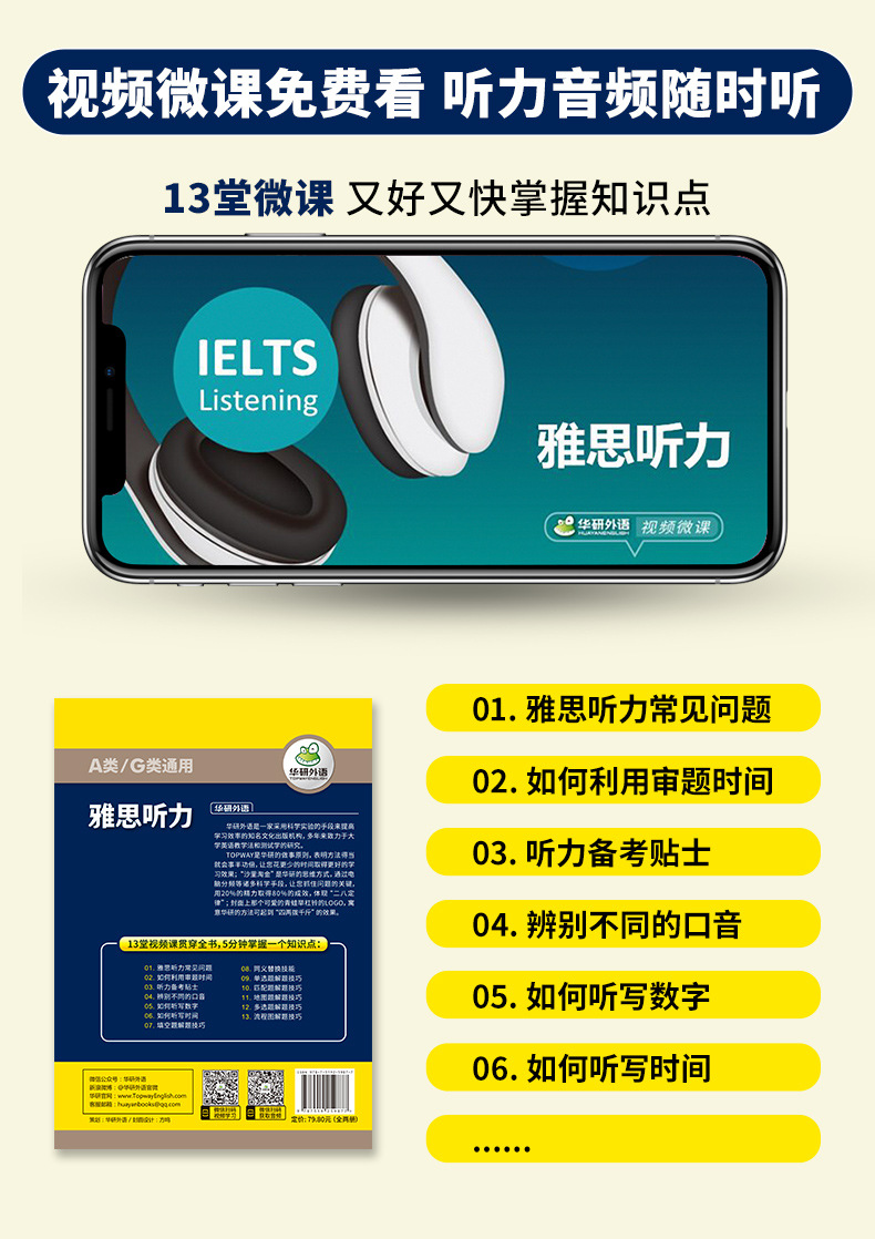 初次接触剑桥雅思考试的考生,包括学术类(A类)和培训类(G类);英语听力基础薄弱的考生;不熟悉雅思听力题型,缺少听力训练的考生;需要进行语音和语料库训练的考生;需要进行教学或自测的雅思培训班师生。