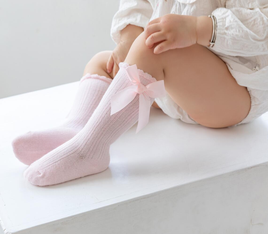 Новые носки с чистыми цветными полосками для мальчиков и девочек, 100% хлопок, нескользящие, с пузырьком, детские носки с бантом средней длины оптом