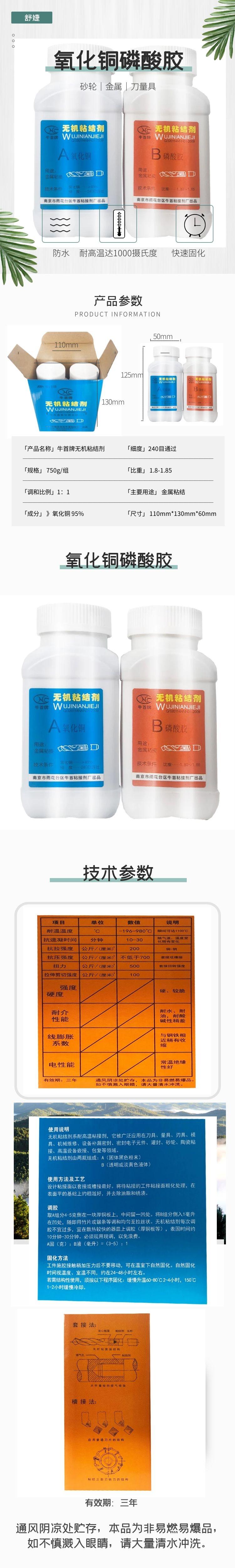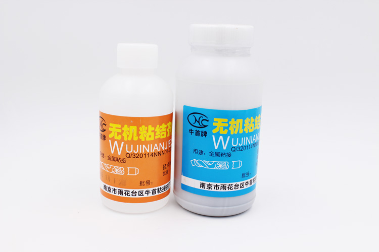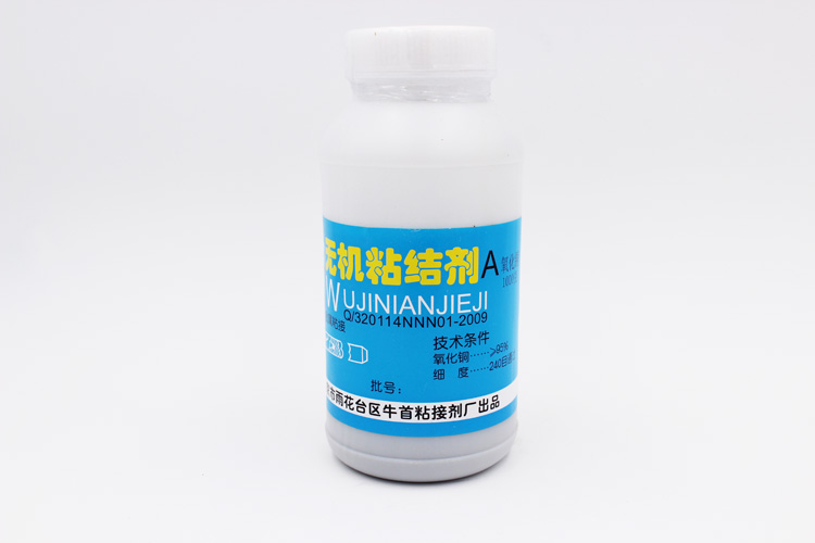 无机粘结剂由两瓶组成。即固体的氧化铜,液态的磷酸胶,称为一套。固体为黑色粉末,液体为白色或微带棕黄色的粘状液体。