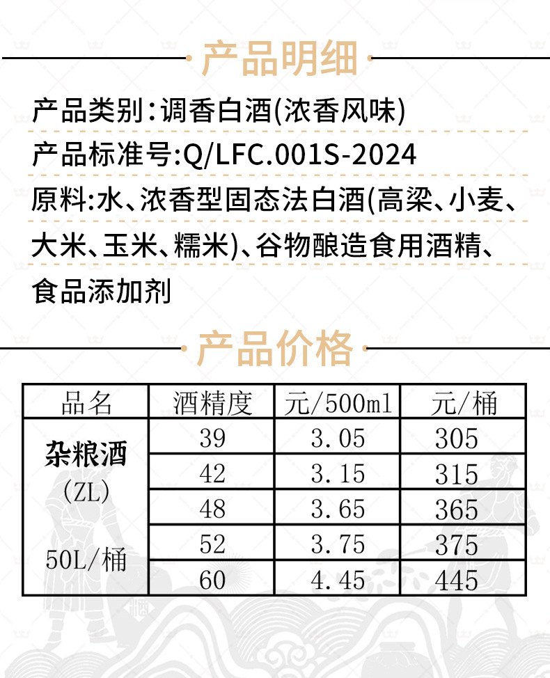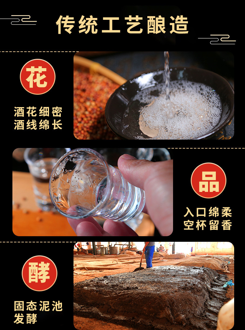 Сырьё и ингредиенты Water, strong-flavor solid-state liquor (gaoliang, wheat, rice, corn, glutinous rice), grain brewing edible alcohol, food additives