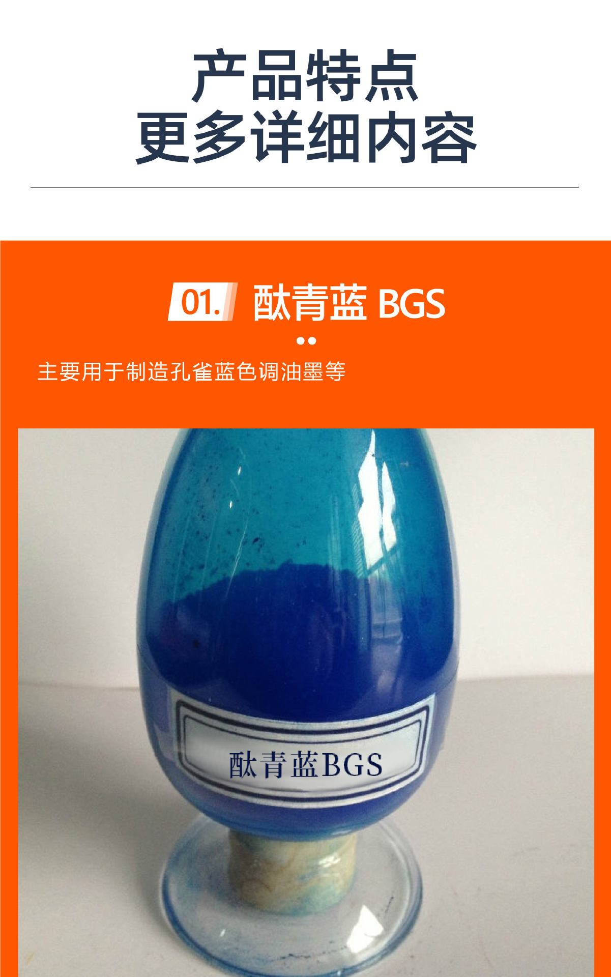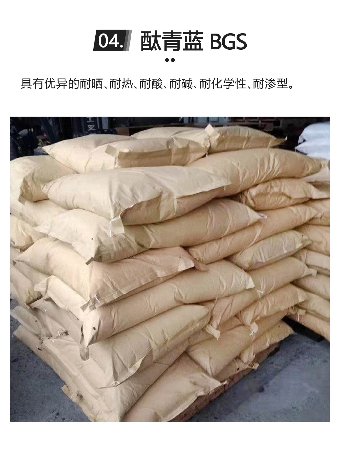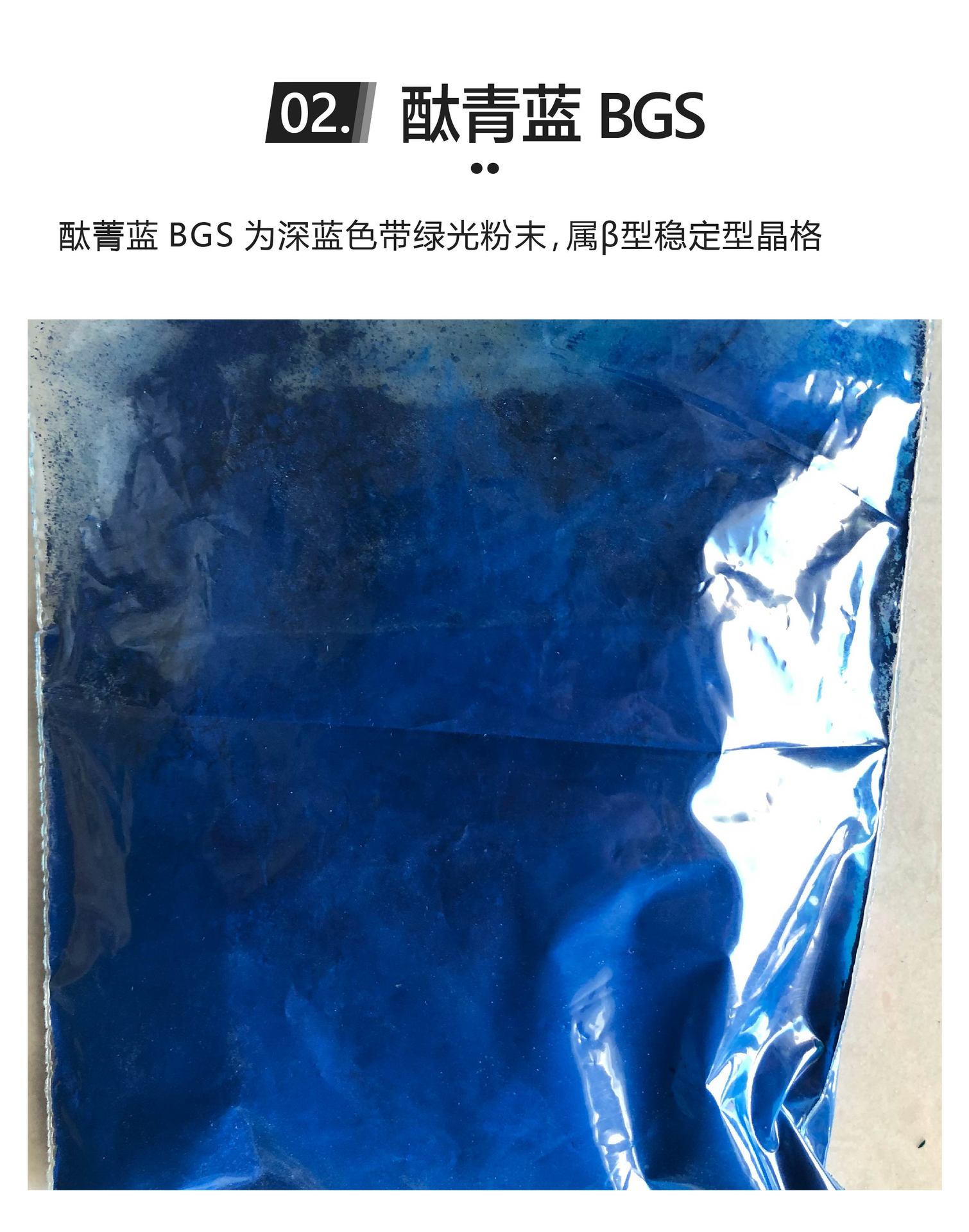 酞菁蓝BGS为深蓝色带绿光粉末,属β型稳定型晶格。色泽鲜艳,着色力强,具有优异的耐晒、耐热、耐酸、耐碱、耐化学性、耐渗型。